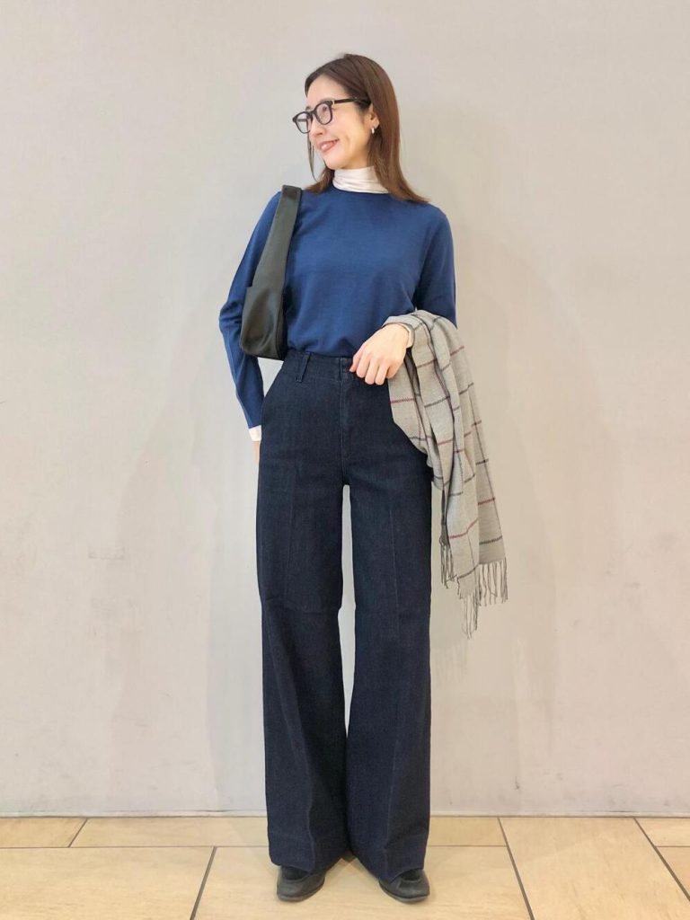 なめらかなメリノウール100%のクルーネックセーターもあります。ベーシックなシルエットで、着丈は少し短く、どんなボトムスにもマッチ。ブルーは深みのある上品なカラーで、タートルネックのインナーをあたたかく重ね着して冬らしく。