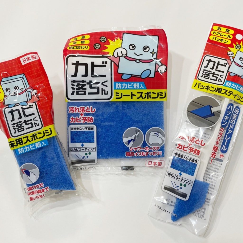 お風呂掃除に大活躍するのが、ダイソーの掃除売り場で発見した「カビ落ちくん」シリーズです。青色の不織布には研磨粒子と防カビ剤が含まれているため、水だけで汚れをおとしながらカビ予防もできます。