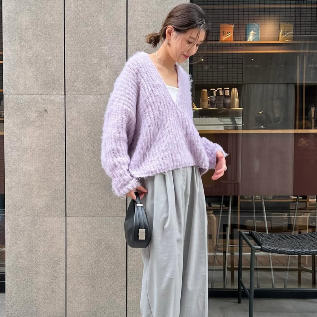 ラベンダーニットに、ライトグレーパンツを合わせた、柔らかなカラー同士の組み合わせです。