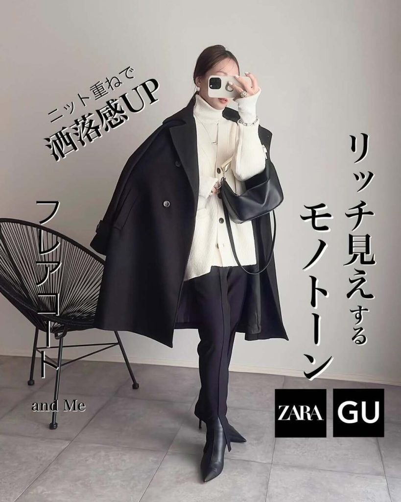 白のタートルネックニット×カーディガンをレイヤードしてアンサンブル風に。シャープな印象のモノトーン配色も、顔まわりに白が入ることで柔らかい印象にまとまります。スリット入りのパンツでモード感もプラスして。