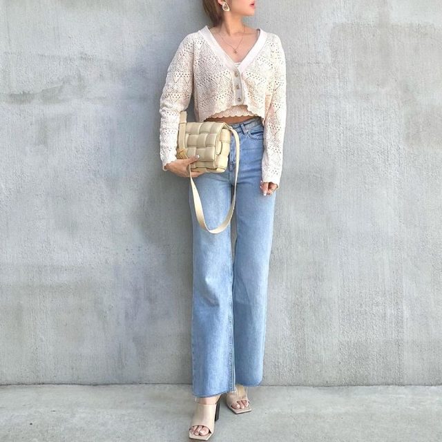 あたたかみのある表面感でシーズンムードが高まる、今季新登場のセーター。浅めのVネックでカジュアルに着こなせます。ベージュのセーターには、グレーのフレアジーンズを合わせて、ジェンダーレスな大人モノトーンスタイルに。