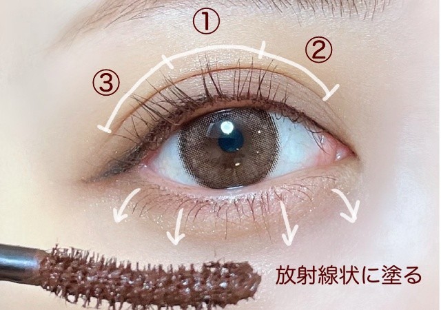 真ん中、目尻側、目頭側と3箇所に分けて丁寧に塗ると、ダマになりにくくきれいに仕上がります。縦塗りにすると、トレンドの束感まつげに!
