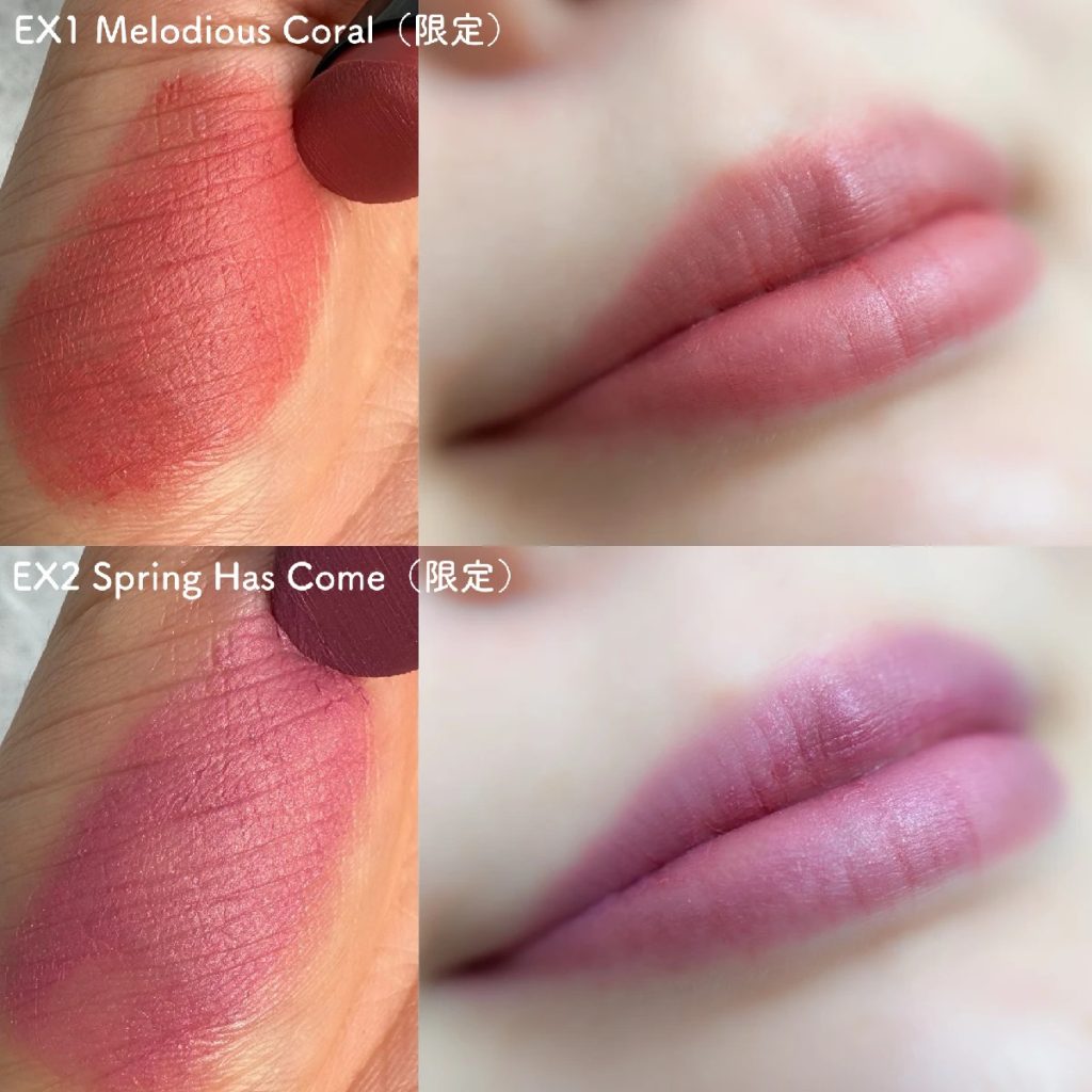 [EX1]は、うららかな陽気を彷彿とさせる鮮やかなコーラル、[EX2]は、春の訪れを告げるライラックモーヴです。