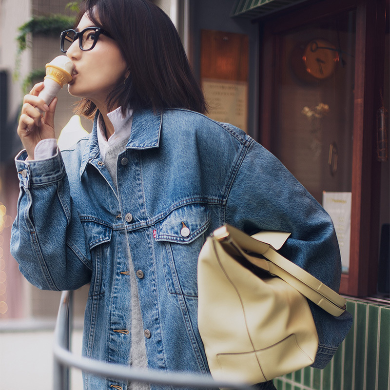 デニムジャケット¥16,500(リーバイス®×ジャーナル スタンダード レリューム/ジャーナル スタンダード レリューム ルミネ新宿店)ニット¥94,600(カオス/Chaos GINZA SIX)シャツ¥30,800(スローン/ザ ショップ スローン 新静岡セノバ店)ハーフパンツ¥38,500(SEA/エスストア)メガネ¥42,900(アイヴァン/アイヴァン 東京ギャラリー)ピアス¥22,000(ブランイリス/ブランイリス トーキョー)バッグ¥372,900(トッズ/トッズ・ジャパン)
