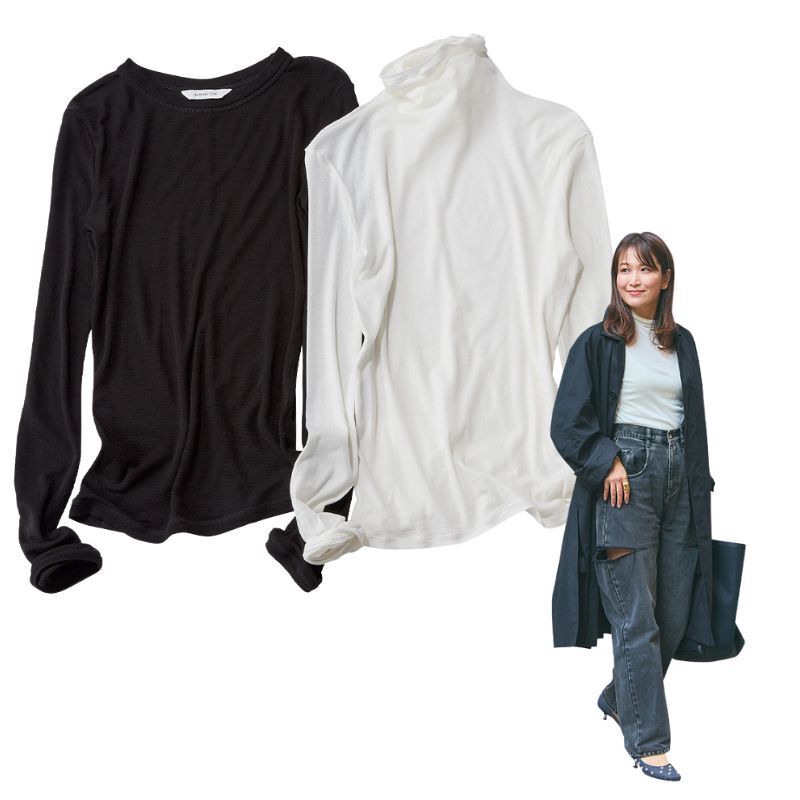 シアートップスは肌着に近い存在で気を使わずに着たいから、H&Mで賢く買物派。着込む冬は露出も減って隙が作りづらいので、シャツやジャケットなどの抜け感作りに重宝します。(VERYライター 増田奈津子さん)