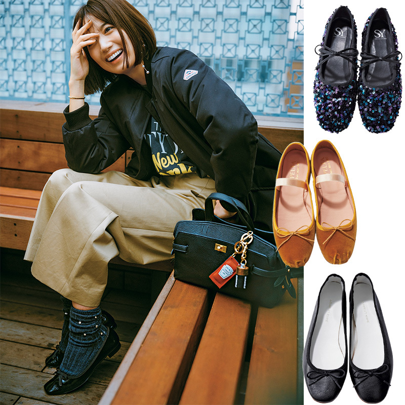 フラットシューズは久々のバレエ登場。 カジュアル服に“足元だけ甘い”が新鮮