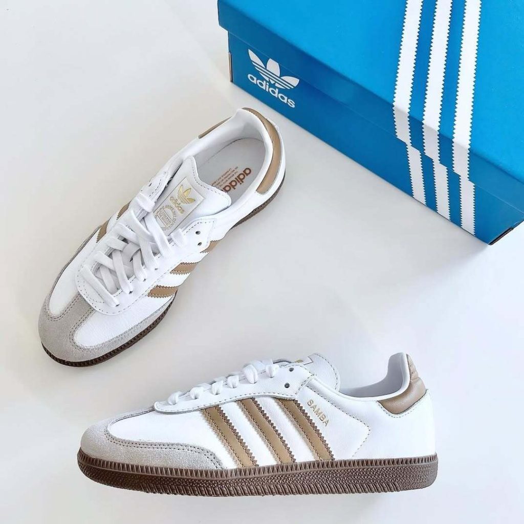 今大人気のアディダスサンバからは、白ベースのデザインをご紹介します。2025春夏トレンドカラーのモカ・ムースのような色味をサイドとかかとに入れていて、上品な雰囲気たっぷり。ベーシックなデザインなので、幅広いコーデに合わせることができます。