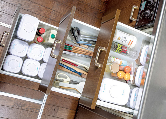 本の出し入れもストレスフリー。オープンラックになっているから、両サイドからサッと手を入れるだけ。バケットには収納物がひと目でわかるメッシュ素材なのもポイントです。