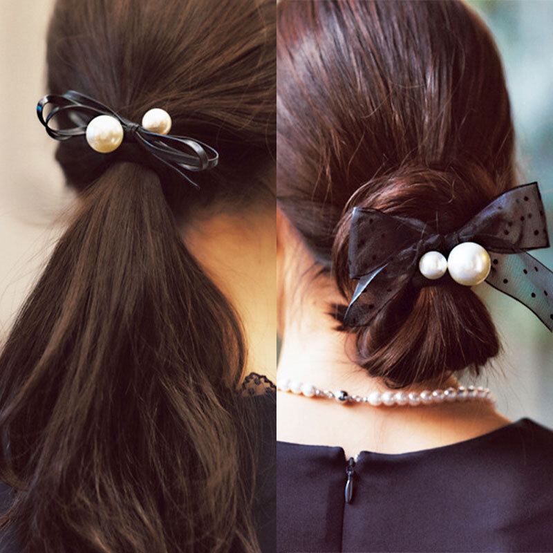 より華やかさを出したい人には、ドットのオーガンジーリボンのタイプを。別の黒ゴムで先に髪をまとめ、さらにこのヘアゴムで結ぶとしっかり。