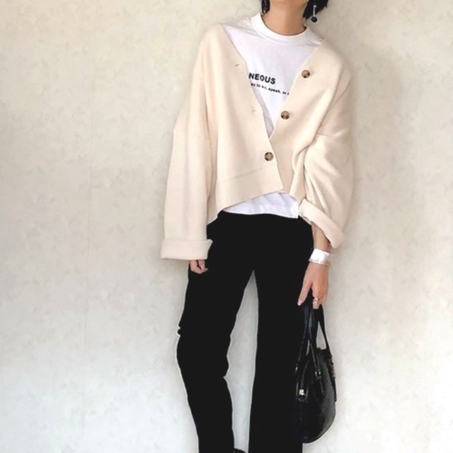 オフホワイト地×黒ボーダーのセーターは、ベーシックでどんなボトムスともマッチ。グレーのワイドタックパンツを合わせれば、大人のきれいめカジュアルコーデの完成です。