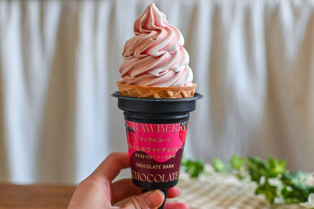 今回で4回目となるコラボレーションの商品として登場した「CHOCOLATE BANK ワッフルコーン ビター&ホワイトチョコレート」は、100%チョコレートバンクのチョコを使用したチョコレートとホワイトチョコレートのアイスに、ストロベリーソースを加えてワッフルコーンを合わせたアイスクリームです。