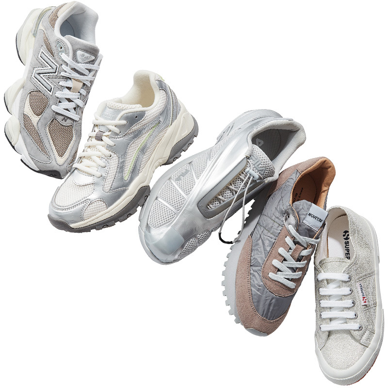 シルバー人気が加速する今、スニーカーでシルバーを取り入れるママも急増中!モノトーンコーデのアクセントに使えておしゃれ感も倍増。オススメのスニーカーと、おしゃれママのスナップをお届けします。