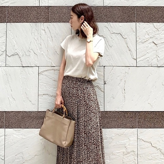 2025春夏のトレンドカラーでもあるオレンジは、なかなかハードル高め。そこでおすすめしたいのが、編集部みんなが声を揃えて「かわいい〜〜〜〜〜〜〜♡」と叫んだジャンプスーツです。大人にも着こなしやすい色味で肌なじみがいいため、実際に着てみた方がずっと好印象。インナーにはカップつきでバストがきれいに見えるエアリズムのTシャツをチョイスしました。ピンク×ライトオレンジコーデにブラウン小物を加えると、トータルでのまとまり感もアップします。