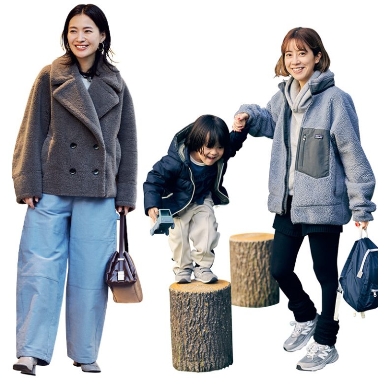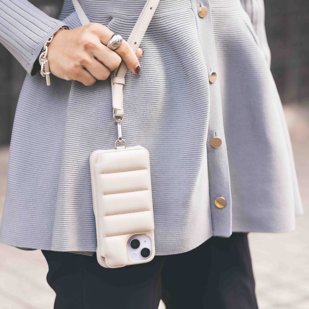 「ぷくぷく感の可愛いさに一目惚れし、思わず購入したDEMIUのスマホショルダーはシンプルながらも印象的なデザインがコーデのアクセントに。子どもの毎日の自転車送迎や、荷物の多いお出かけに使用しています。背面にはカード入れが3箇所あり、クレジットカードなどの決済系のカードを入れています。バッグの中でお財布を探さずに買い物できるところも便利で重宝しています」髙松愛里さん・36歳(162cm/4歳と2歳の女の子、1歳の男の子ママ)