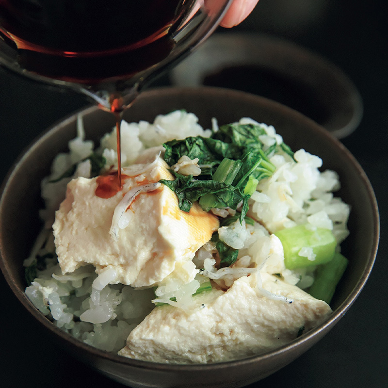 -炊きあがったら小松菜をのせ、蓋をして5分蒸らす。全体をふんわり混ぜる(豆腐をくずしすぎないように注意)。器に盛り付け、お好みで醤油をかける。