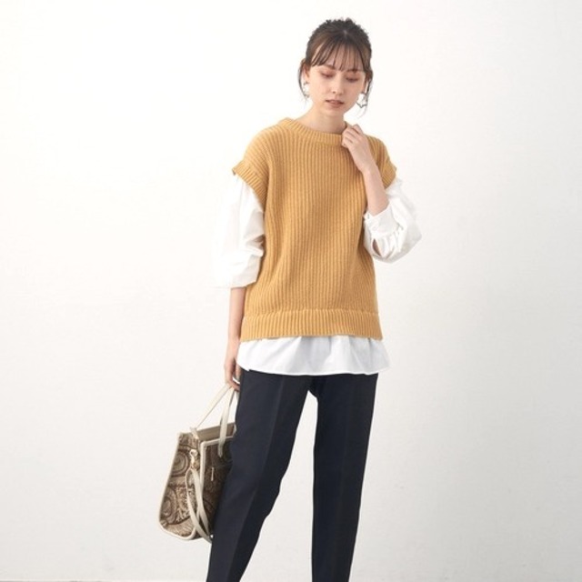 通勤ママは ケープダウン×きれい色ニットで黒コーデにメリハリを