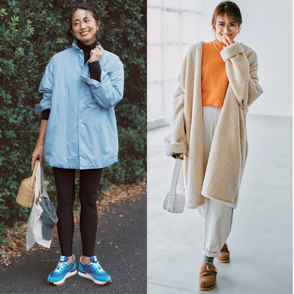 ママ友宅でのランチ会へ。気負わずともサマになるショールカラーのボアコートが頼れます。ゆとりあるシルエットによりニットの上から羽織りやすく、抱っこ紐ママにもうってつけ。オレンジニットで顔まわりを華やかに盛り上げれば、写真映えも叶います。