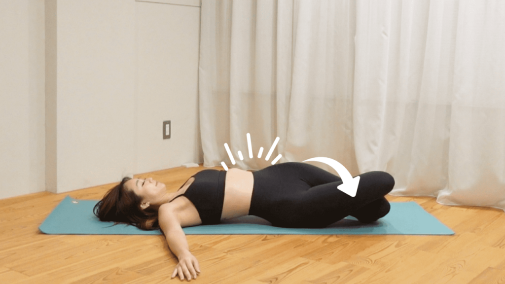 ②両膝を右側へ倒して、左のウエスト周りから腰の外側にかけて伸びが広がるのを感じましょう。反対側も同様に行います。