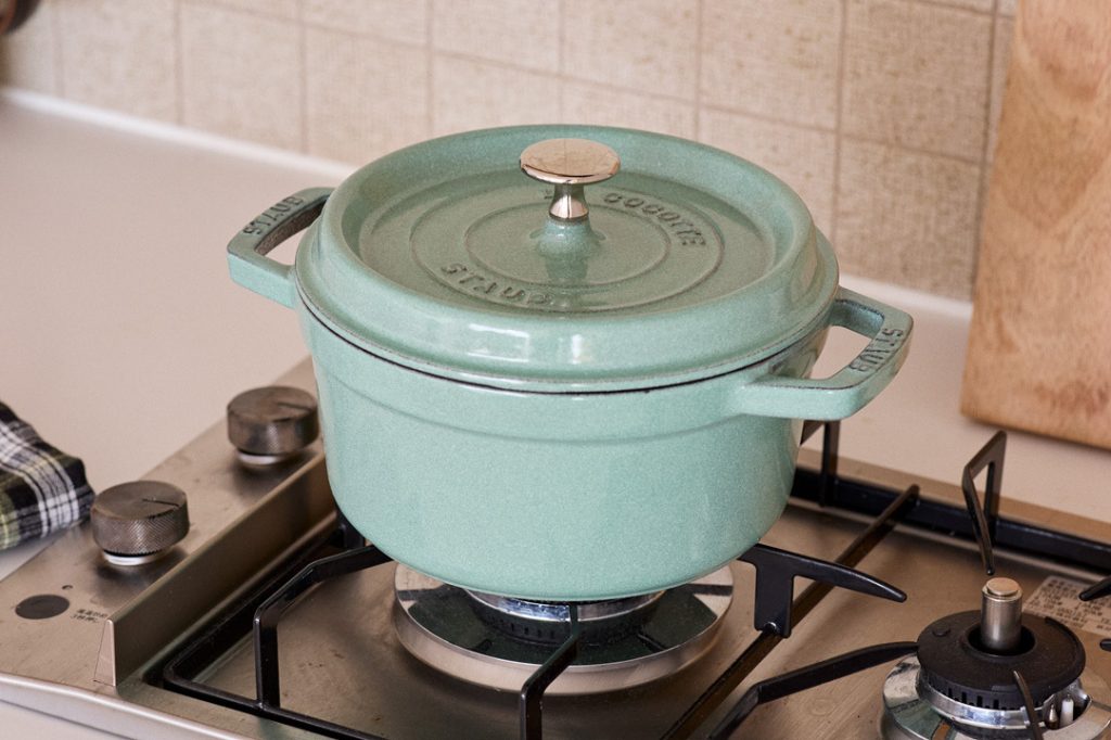 《ストウブ》で大人気の「ピコ・ココット 20cm」の人気色、セージグリーン。欧州では古くから健康や家族愛の象徴として知られている色で、まさにお鍋にぴったり。そして肝心のスペックもしっかりおさらいを。重い蓋を閉めると鍋の密閉性が高まり、食材が持つ水分だけで調理可能なので、素材本来の美味しさと栄養を引き出せる。熱伝導性と保温性の高さも優れている。[H14.2 × W26.3× D20cm ]¥30800 / STAUB(ツヴィリング J.A. ヘンケルスジャパン)