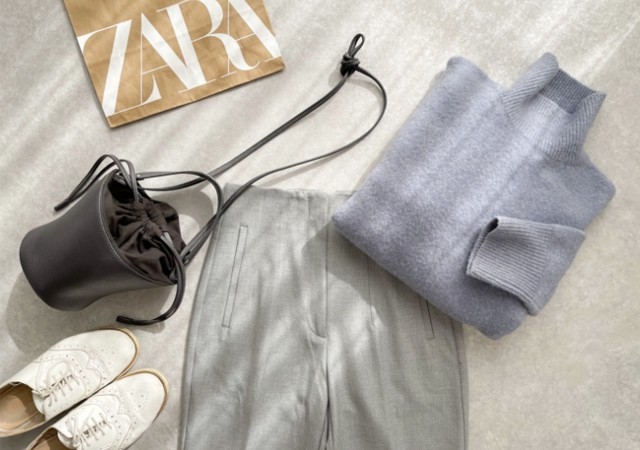 春コーデのマストハブアイテムとしても話題になっているコットンニット。こちらは半袖と立体感のあるポップコーン風の編地というアップデートが加わっています。ブルーのグラデーションコーデなら上品な雰囲気も手に入ります。このままトータルでマネしたい着こなしですね。