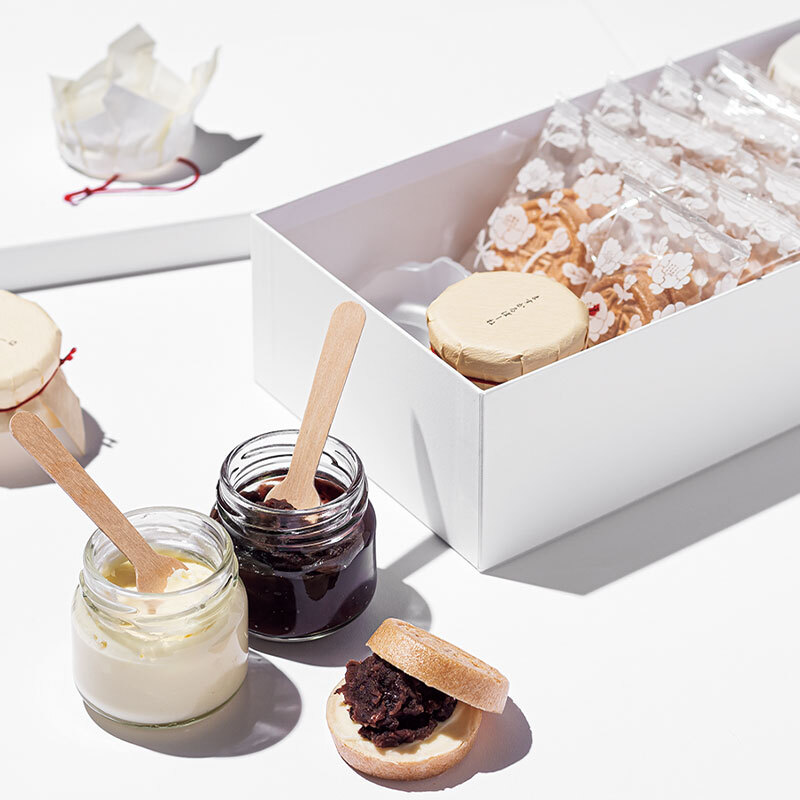 羽二重糯を使用した最中皮の香ばしさとサクサク感が最高♡自分で餡とマスカルポーネチーズを使った自家製クリームを挟んで食べるスタイルが楽しく会話のきっかけになるので、訪問先で盛り上がります。目上の方へ失礼のない高級感も選ぶ理由に。