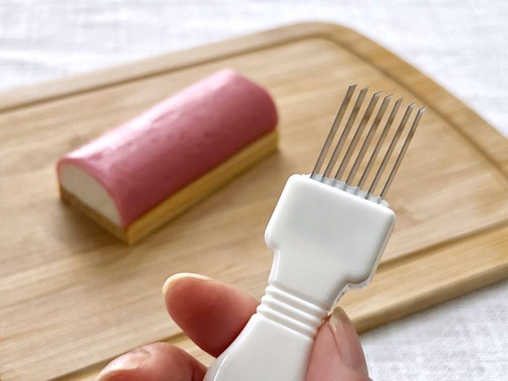 ネギカッターでかまぼこの表面に切り込みを入れます。