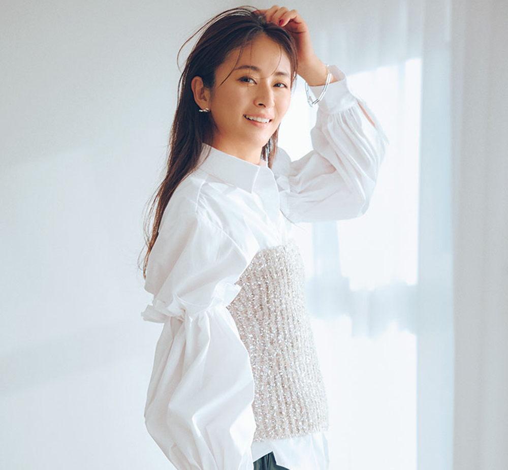 甘シャツ揃いのランチ会だって、アカ抜け感を狙える微細な上品ラメ。袖甘ブラウスの既視感は、煌めきを放つビスチェでエッジの利いた装いへと導きます。