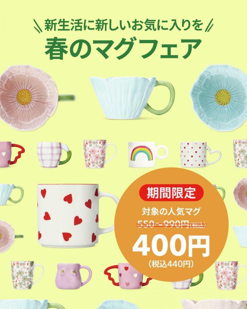 550~990円の対象のマグカップが440円で購入できる、期間限定のお得なキャンペーンです。