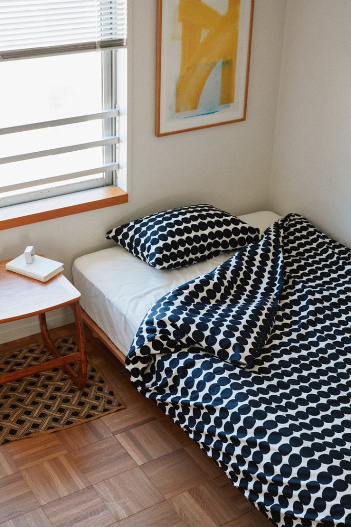 1951年にフィンランドで誕生したデザインハウス《》のベッドリネン。白地に黒のサークルモチーフをリズミカルに連ねたモダンなデザインは「ラシィマット」の名で、2009年の登場以来ロングセラー。デュべカバー[H210×W150cm ]¥26400、ピローケース[ H50×W60cm]¥6160/Marimekko(ルック ブティック事業部)