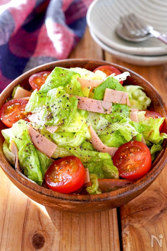 レタスにハムを加えて、レモン醤油ドレッシングでまとめたサラダ。ポリ袋で混ぜるだけで、香りが爽やかなさっぱりした味わいに仕上がります。盛り付けてからミニトマトをトッピングすると、ぱっと映えて素敵ですよ。
