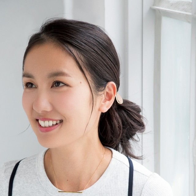 ストレートアイロンを髪全体に通し、毛先をナチュラルな内巻きに。スタイリング剤はオイルを使い、レイヤー部分にもよくなじませて動きとツヤ感を与える。太めのアイロンで毛先を巻いてボリュームアップすれば、華やかな印象が楽しめる。