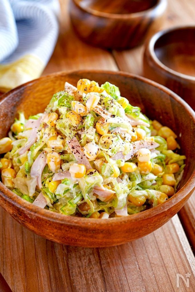春キャベツの爽やかな食感を楽しみたいときは、シンプルなコールスローがおすすめです。人参やハム、コーンなどをプラスして彩りよく栄養たっぷりに仕上げましょう。お好みで黒胡椒を振るとさらにおいしくなります。