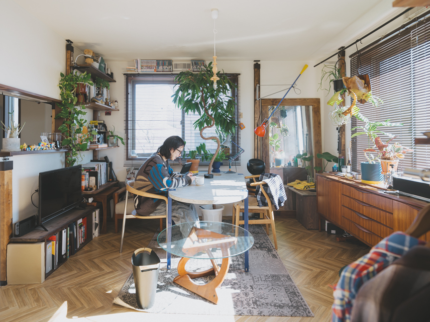 「できる限り植物に囲まれて過ごしたいと考えた結果、植物と一緒にご飯を食べられるスペースにしてしまおうと、テーブルを奥さんとDIYして作りました」