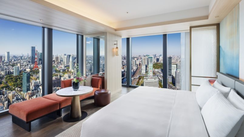 日本の伝統と現代美を融合させた客室には、独立したリビングルームとベッドルーム、バスルーム、ウォークインクローゼットを完備。さらにハンドメイドのデキャンタやプレミアムなカクテルアクセサリーなど、オリジナルのラグジュアリーアメニティも用意されています。