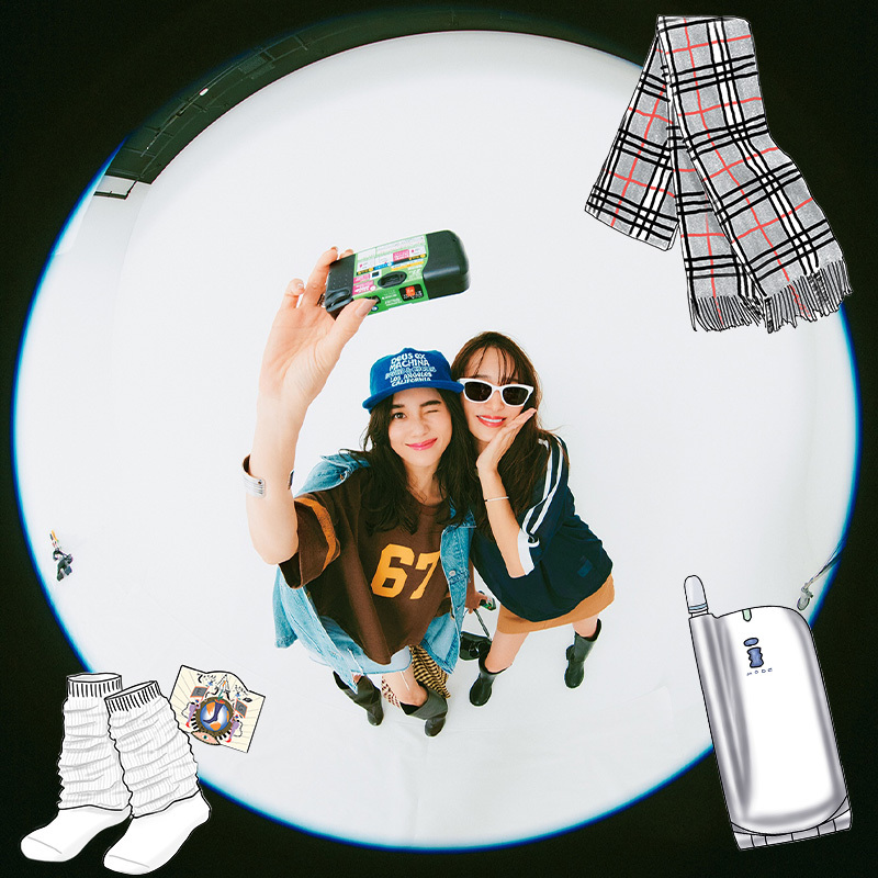 【KATEのフラッシュクラッシュ】’97年にブランドデビューしたKATE。’99年に発売され、当時まだ珍しかった3色パレットシャドウは記録的大ヒットに。【バーバリーチェックのマフラー】冬の通学といえばこれ一択! 【LOVE BOATのミラー】裏にプリクラを貼るのがお約束。