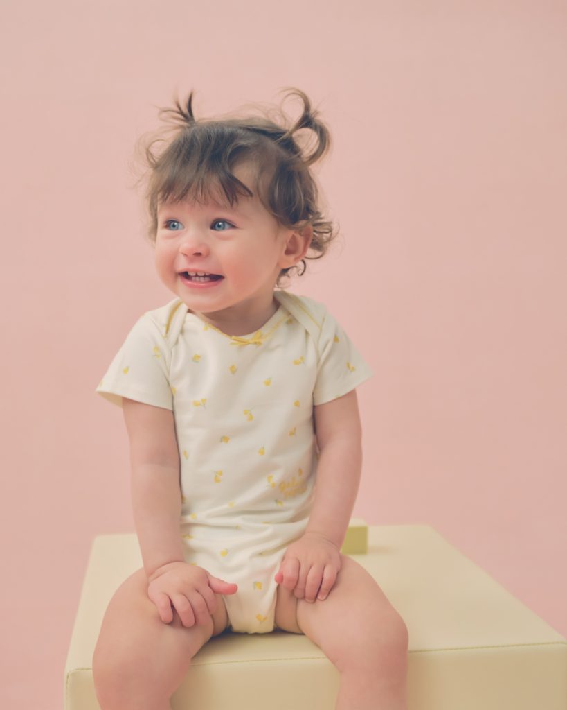イエローの小花柄のボディスーツは女の子の定番の柄。襟元に飾られた小さなリボンがかわいらしさをより一層引き立てます。