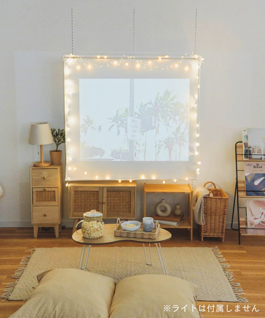 別売りのLEDライトを取り付けて、部屋の照明を落とせば、ロマンチックなスクリーンのできあがり。使わないときは巻き取って収納できるので、インテリアの雰囲気を壊すこともありません。