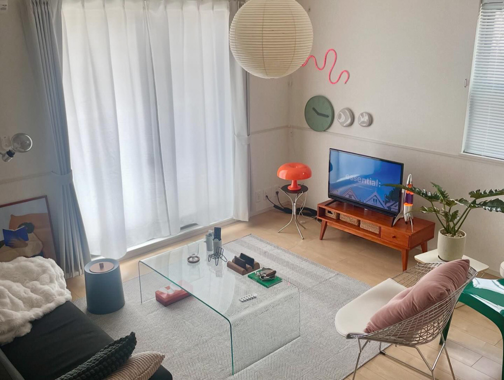 丸や曲線、抜け感、色味など統一感があるうえでセレクトされた家具なので、ごちゃごちゃしたように見えない手腕は、さすがです。