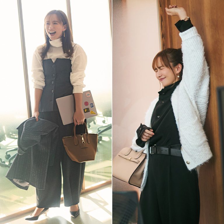 インナーはしっかりと着ても、どうしてもそわそわしちゃうショート丈トップス。そこで取り入れたいのが、セットアップです。同色を選び縦で繋げると、着丈の短さによる好バランスがGOODポイントに!ジャケットを羽織ればこのままオフィスコーデとしても着回せそうです。