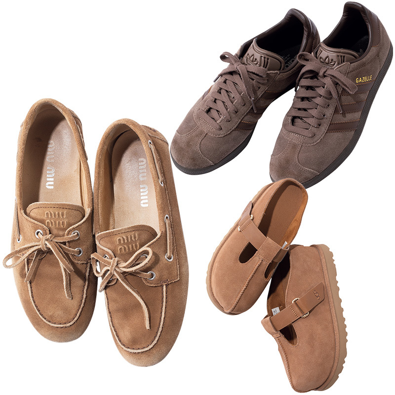 ブームが来る前からしつこいほどにブラウン推しで、自社製品でもブラウンのエッセンシャルアイテムが自ずと豊富に。名品カジュアルシューズも、一足でリッチに垢抜けさせる茶系スエードが優勝!