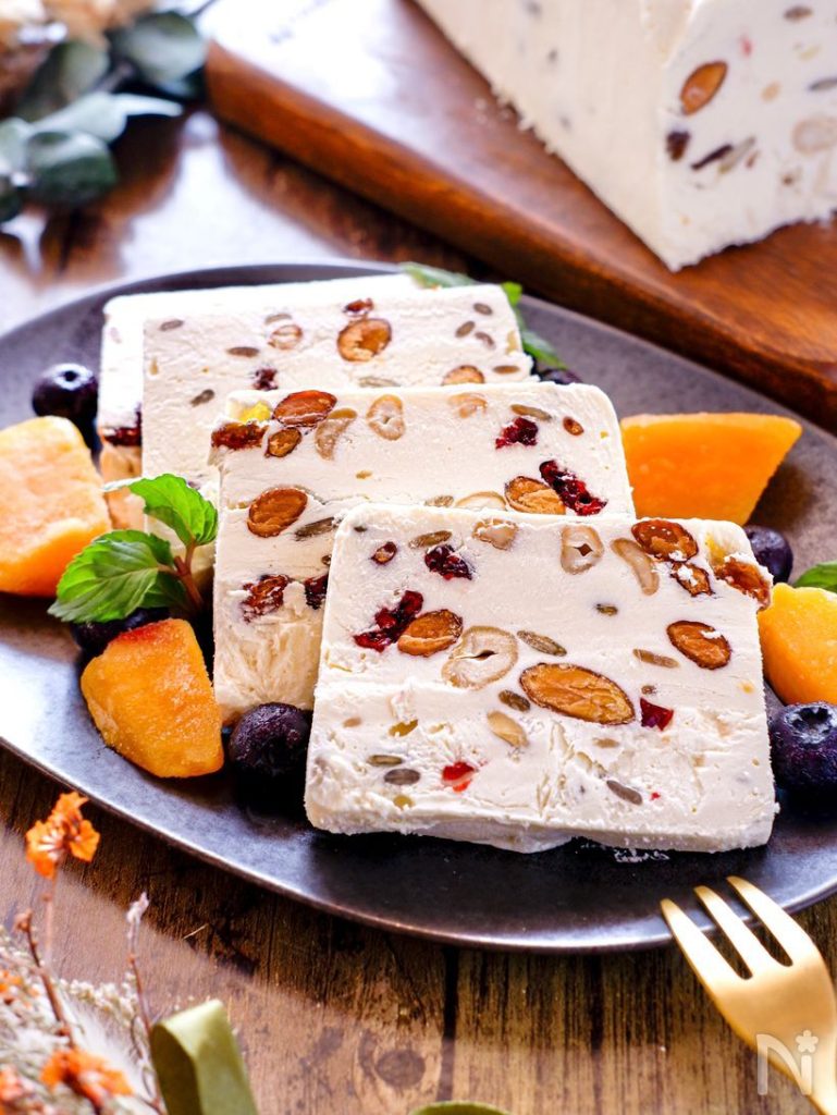 ヨーロッパのアイスデザート「カッターサ」がおうちで簡単に作れます。生クリームとクリームチーズの生地にナッツやドライフルーツを混ぜて冷やし固めるだけ。おしゃれに映える仕上がりで贅沢な味わいが楽しめます。