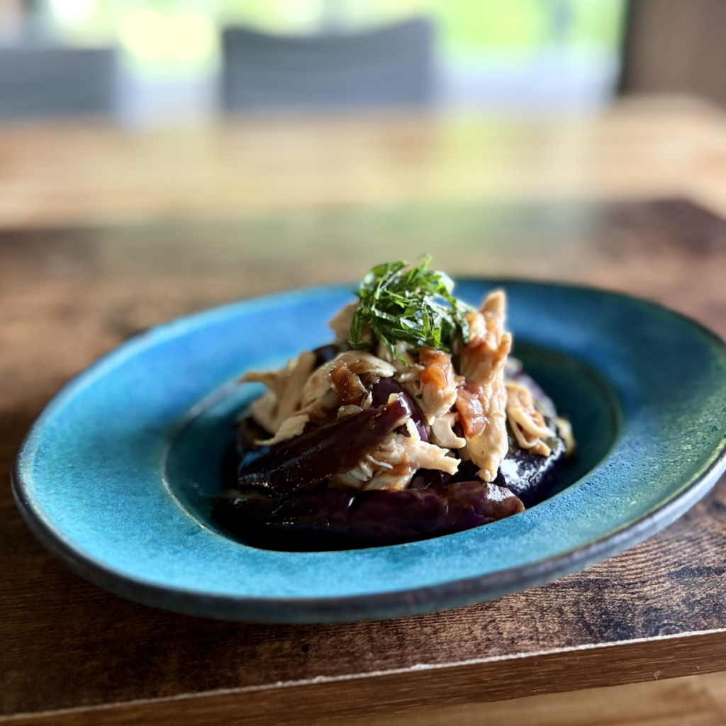 茄子もささみも食べやすい大きさに手で割くというのも気楽ですし、断面からタレが染み込みやすくもなります。長なすを使った場合は、適宜食べやすい長さに切ってから割くとよいと思います。