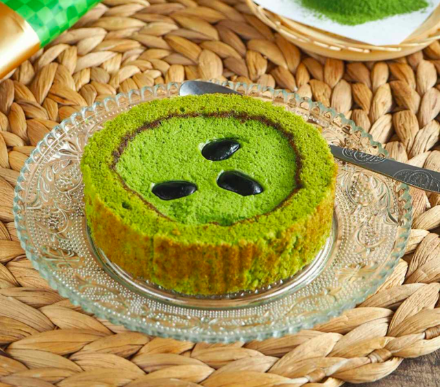 米粉が使用されたもっちりとしたほうじ茶生地のオリジナルスイーツ「米粉のほうじ茶コヌレ(こしあん入り)」。なかにはこしあんを包んでいます。