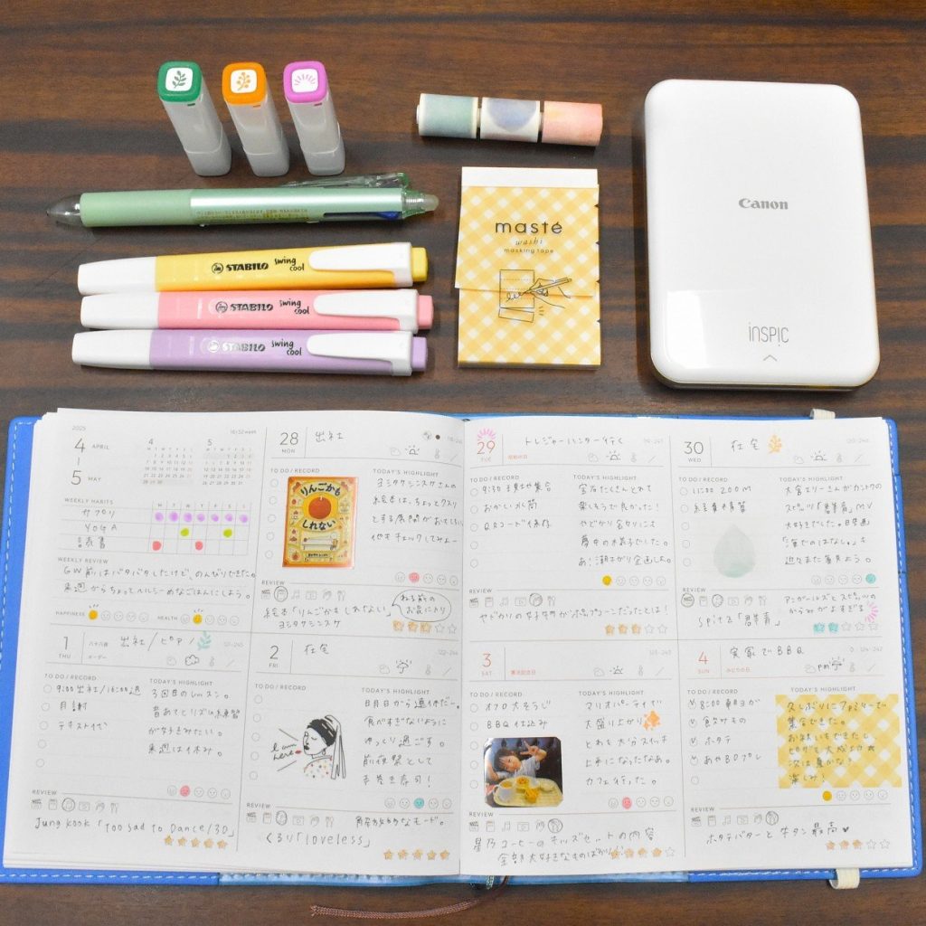 夫と5歳の娘と3人でキャンプやボードゲームをするのが、最近の休日の過ごし方。手帳にはスケジュールやタスク管理の他に、子どもと一緒に楽しめる絵本や映画を書き留めている。趣味は週2で通うホットヨガ。しかしながら「ヨガだけでは痩せないのでは? と最近気づき始めたんですよ(笑)。」と本音? もチラリ。BTSが好き。