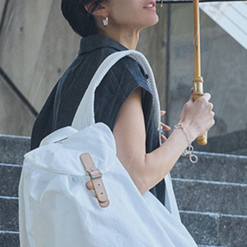 片手に傘、片手で子どもと手を繋げるリュックは雨の日登園の最適解。通勤もクリア、清潔感も華やかさも託せる白を効かせたコーデで気分アップ!