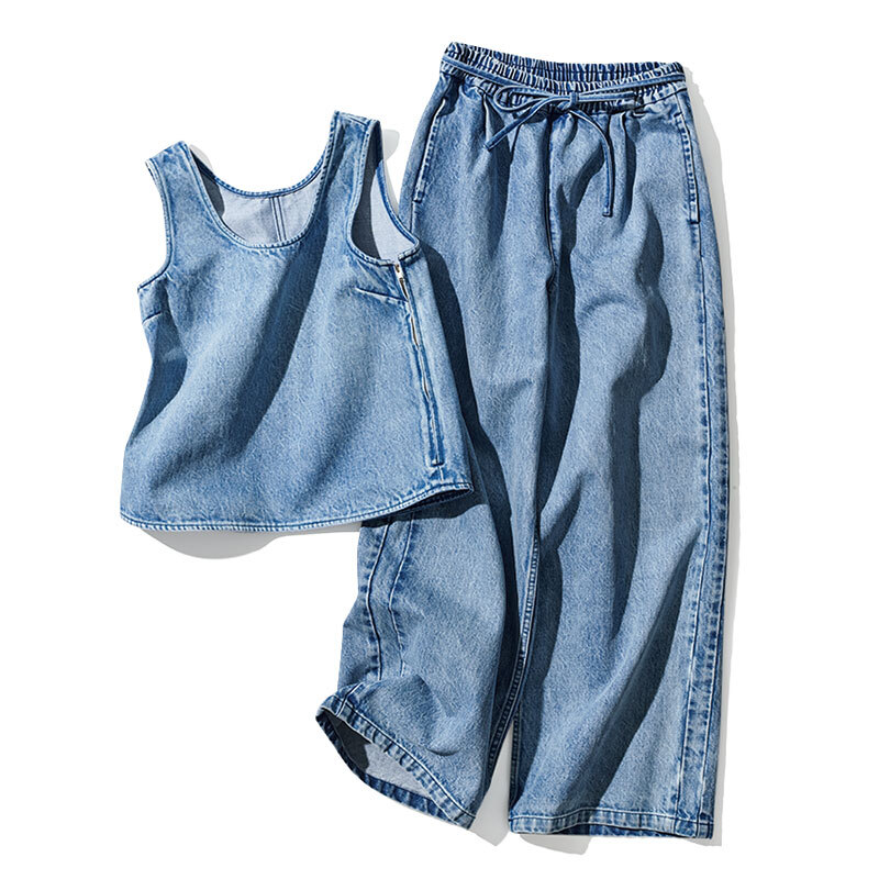 セットアップならデニムONデニムのハードルが下がって、タイパも抜群。タンクトップ¥33,000パンツ¥47,300(ともにサードマガジン)