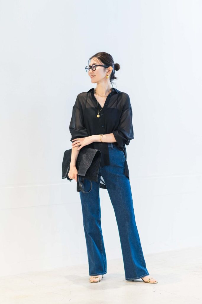 「以前出ていたトラウザージーンズを愛用しているのですが、窮屈さを感じず一日中ノンストレスで穿けるデニムは他にないほど、履き心地抜群のデニムです。新型はスリムフレア!大人が気になる腰回りやヒップはシュッとスリムに見せてくれて、膝上からはフレアに広がるデザインなので足長効果も絶大です。シースルーのシャツを合わせて、暑い日でも涼しげに見えるようコーディネートしました。」