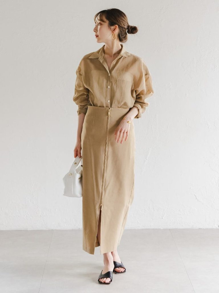 週末前の金曜日は、ちょっとだけ肩の力を抜いた軽やかさを意識。透け感のあるベージュシャツに同系色のタイトスカートを合わせたワントーンスタイルが、しなやかな女らしさを演出します。ゴールドのアクセサリーや白バッグを効かせて、上品だけどこなれた雰囲気に。社内でのプレゼンや、午後からの打ち合わせにも好印象なきちんと感が出ますよ。金曜ならではの“抜け感と信頼感”の好バランスコーデです。