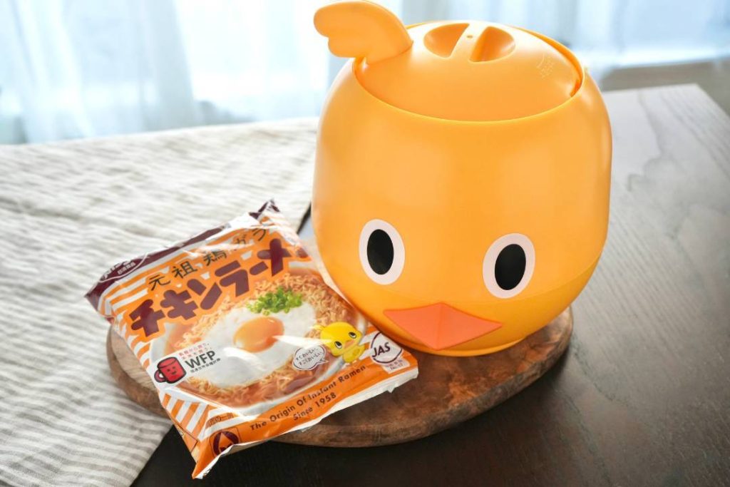 「チキンラーメン」のキャラクター「ひよこアニキ」を模した「しろたまメイカー」。顔が上下半分に分かれる仕様になっていて、下半分はどんぶりとして使えます。上のキャップは「ぴょこ毛」の向きがポイントです。