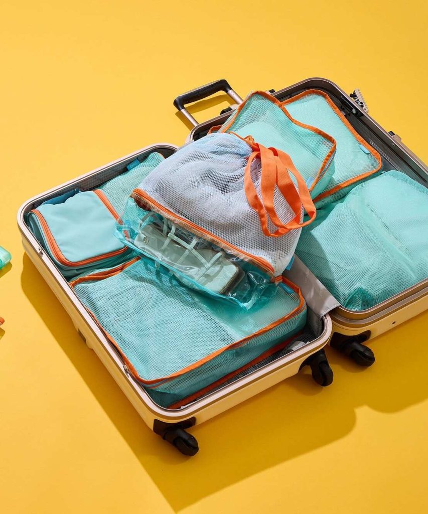 こまごまとした小物を収納するのに便利なミニポーチのセットもあります。ブルー、オレンジ、クリアのカラーが夏らしくて爽やか。こちらも軽くてコンパクトなので、バッグでスリムに収納を叶えます。